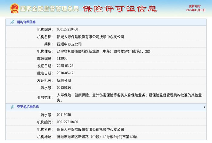 3月31日,根据国家金融监管总局许可证信息查询平台,阳光人寿保险股份有限公司抚顺中心支公司换发保险许可证,发证日期2025年3月28日。