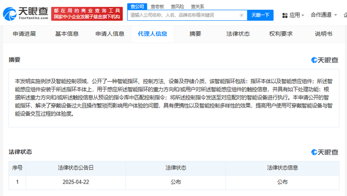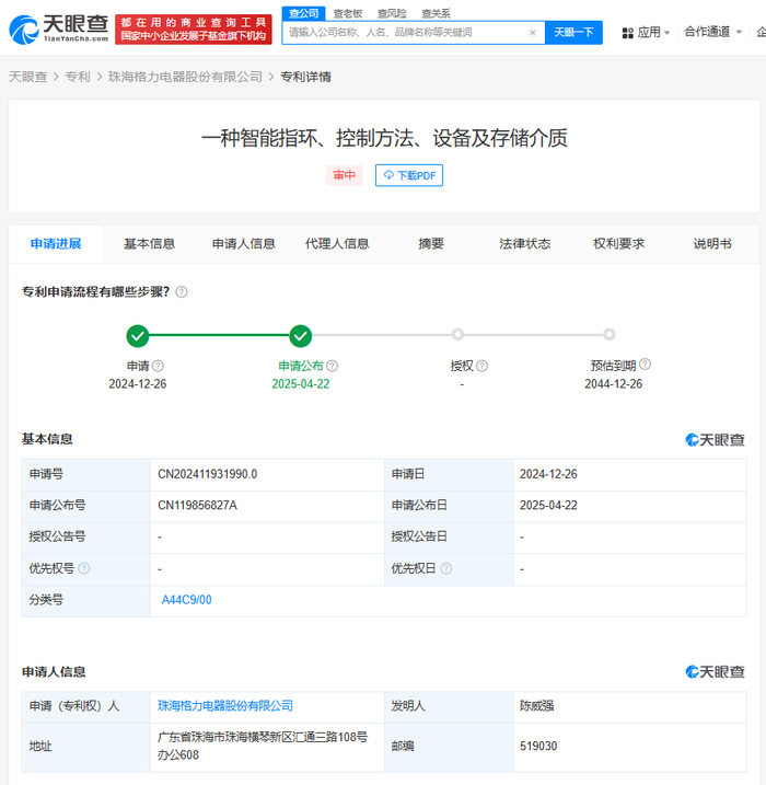 天眼查App显示,近日,珠海格力电器股份有限公司申请的“一种智能指环、控制方法、设备及存储介质”专利公布。