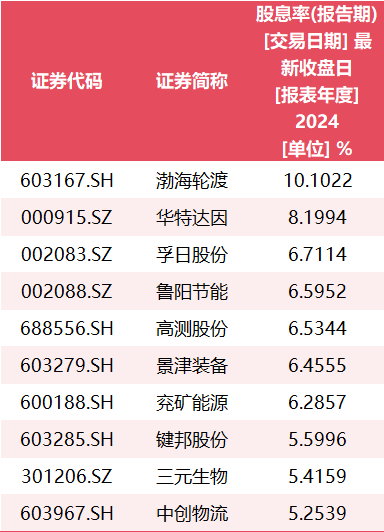 在大手笔分红的情况下,不少鲁股的股息率颇为诱人。经济导报记者注意到,截至4月29日收盘,以2024年度的分红金额计算,渤海轮渡(603167.SH)、华特达因(000915.SZ)、孚日股份(002083.SZ)、鲁阳节能(002088.SZ)、高测股份(688556.SH)等10只鲁股的股息率超过5%。渤海轮渡最高,达到10.10%。