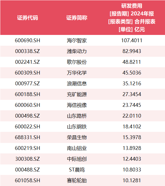 同时,有14家山东上市公司2024年的研发费用超过10亿元。其中,海尔智家最高,达到107.40亿元;潍柴动力、歌尔股份、万华化学、浪潮信息(000977.SZ)、兖矿能源、海信视像(600060.SH)、山东路桥(000498.SZ)的研发费用均超过20亿元,分别为82.99亿元、48.82亿元、45.50亿元、35.12亿元、27.35亿元、23.74亿元、22.01亿元。