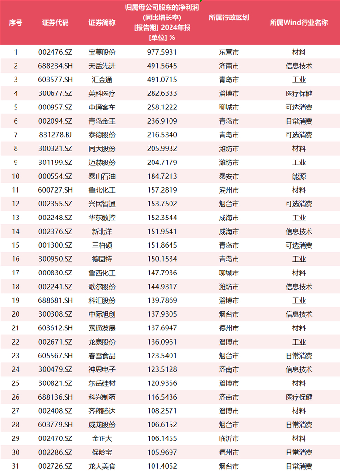 从2024年的业绩增长情况看,鲁股呈现出积极向好的态势。309只鲁股中,有155只的归母净利润同比增长,占比超过5成。有31只的归母净利润增幅超过100%。