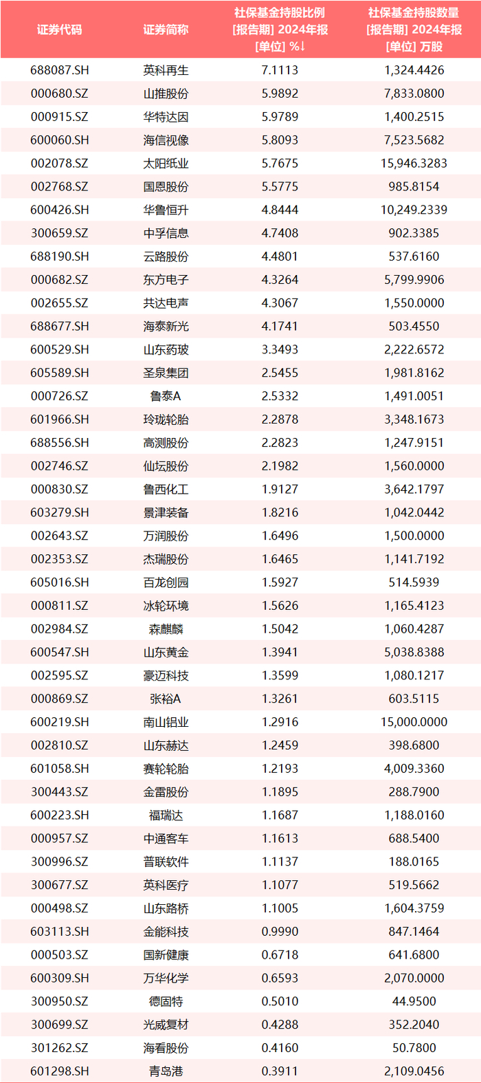统计显示,2024年末有44只鲁股的十大流通股东中出现了社保基金的身影。其中,英科再生(688087.SH)十大流通股东中,社保基金占4席,分别是社保基金17042组合、2103组合、112组合以及111组合,凸显出社保基金对该公司的青睐。