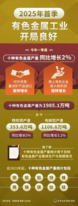 中国有色金属工业协会最新公布的数据显示,今年一季度我国有色金属工业实现良好开局,十种有色金属产量同比增长2%,对外贸易重点矿产品进口保持增长,规模以上有色企业收入和利润保持增长。
