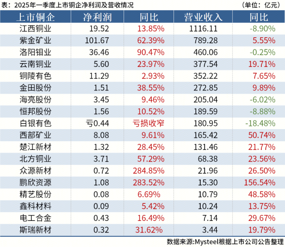 记者了解到,截至4月底,有18家上市铜企公布2025年一季度业绩,超过九成的上市铜企盈利,超过七成的上市铜企营业收入扩张。从2025年一季度净利润来看,17家上市铜企实现盈利,仅有1家亏损。其中,紫金矿业净利润101.67亿元高居第一,洛阳钼业净利润36.46亿元排名第二,江西铜业净利润19.52亿元位列第三。