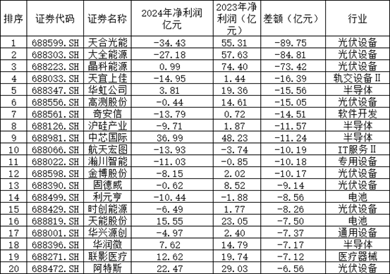 以下为科创板拖累TOP20(利润下降绝对金融前20名)