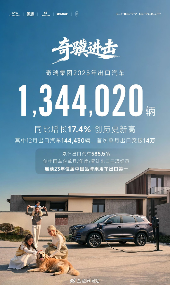 出口方面,奇瑞集团12月出口汽车144430辆,同比增长46.8%,首次单月出口超过14万辆,创造了新的历史纪录;全年出口汽车134.402万辆,同比增长17.4%;累计出口汽车585万辆,创造了中国车企单月出口、年出口、累计出口三项纪录,连续23年位居中国品牌乘用车出口第一。