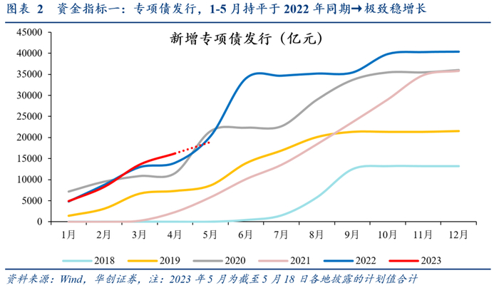 1、资金指标一:专项债发行,体现卖地以外、政府可控的二本账稳增长力度;1-5月持平于2022年同期→极致稳增长。从规模看,1-5月新增专项债发行约1.9万亿,接近去年同期2万亿;从进度看,若不考虑存量限额盘活,1-5月新增专项债发行完成全年进度50%,持平去年同期,明显快于2019年同期(40%)和2019~2022年同期平均(42%)。