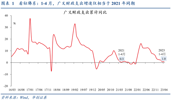 1-4月广义财政支出同比1%,仅较2021年同期高0.7%,看似“佛系”。