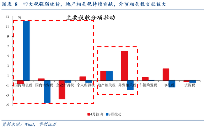 个人所得税、国内消费税由Q1的偏弱变为偏强:个税同比8.6%(3月-7.1%)、国内消费税同比3%(3月-32.5%),合计拉动税收增速1.1个百分点(3月拖累4.8个百分点)。主要是Q1拖累因素消失:消费税偏弱,主要是去年四季度“抢收”,延至今年初缴库的较少;个税偏弱,1-2月拖累或来自年终奖,一季度限售股转让等财产转让所得下降较多。