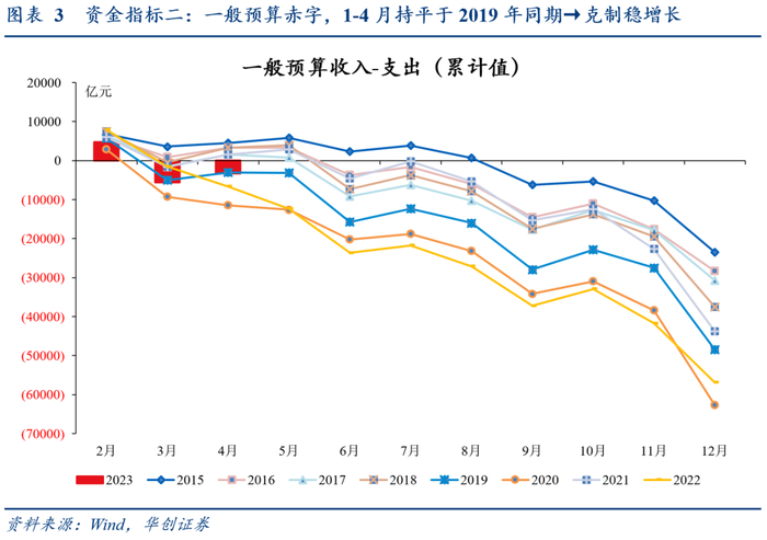 2、资金指标二:一般预算赤字,体现一本账稳增长力度;1-4月持平于2019年→克制稳增长。从规模看,1-4月一般预算赤字3247亿,低于2022年同期6640亿,基本持平2019年同期3016亿(图3);从进度看,1-4月一般预算赤字约占全年预算5.6%,明显慢于2022年同期(11.7%),基本持平2019年同期(6.2%)。