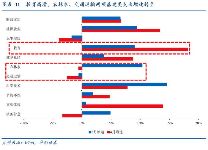 分支出类型看,教育高增基建趋弱:4月三项代表性民生类支出(社保就业、卫生健康、教育)较强,合计拉动支出增速4.2个百分点(3月拉动1.5个百分点),其中教育高增18.1%、拉动2.6个百分点,卫生健康拖累扩大至0.4个百分点。基建类支出(城乡社区、交通运输、农林水)贡献回落,合计拉动支出增速0.4个百分点(3月拉动1个百分点),主要是城乡社区拉动0.5个百分点,交通运输、农林水均小幅拖累。科技环保贡献回落,合计拉动支出增速0.4个百分点(3月拉动2个百分点)。