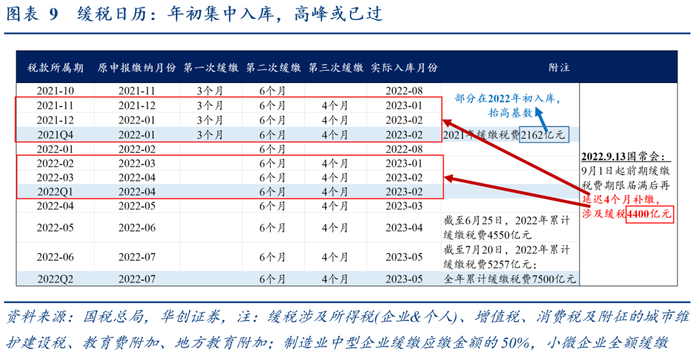 国内增值税、企业所得税由Q1的偏强变为偏弱:国内增值税同比4%(3月32.1%)、企业所得税同比-5.7%(3月-2.9%),合计拖累税收增速4.4个百分点(3月拉动11.7个百分点)。考虑到3月经济仍在修复(4月税收主要反映3月经济),或有两股力量导致两大税增速放缓:一是制造业中小微企业缓税年初集中入库、高峰或已过(图9);二是3月以来PPI同比加速下行,导致减收,如增值税,除了和工业增加值相关,还受工业生产者出厂价格影响;企业所得税不仅取决于工业经济恢复情况,还要看工业企业利润。
