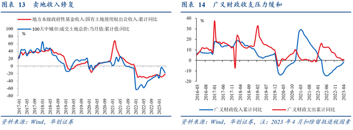 4月政府性基金支出增速回正(2.4%,3月为-20.2%),为2022年7月以来首次,主要是卖地修复的收支联动。虑及去年5-6月新增专项债发行高达2万亿,高基数下增速或再次下探。