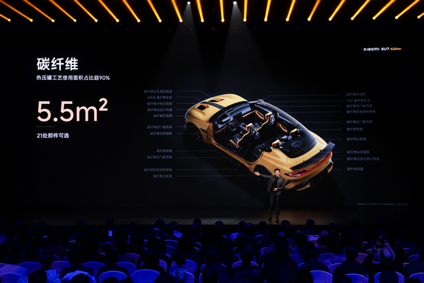 小米SU7 Ultra的设计围绕巅峰性能展开,加入空气动力学套件,最大下压力可达 285kg,媲美超跑级车型。全车满配共21处使用碳纤维,总面积达 5.5m²,不仅更富运动感还有效实现轻量化。全系标配 24k金碳纤维车标,黑金搭配,低调奢华。