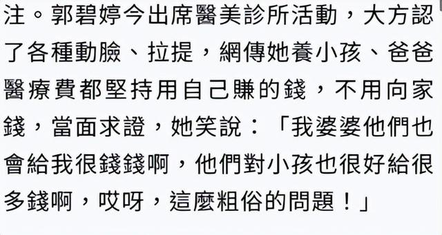 对此,郭碧婷回应,“婆婆也会给我很多钱钱啊,他们也对小孩很好啊,都会给很多钱钱”,说完,自己忍不住笑了,以一句“哎呀!多么粗俗的问题呀”带过。