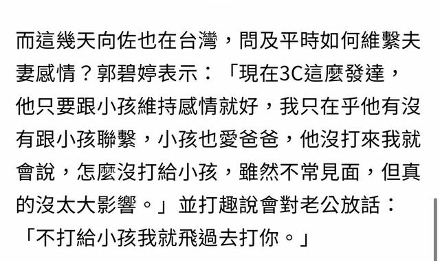 郭碧婷表现得并不在意,她透露自己跟向佐不会每天聊电话,但向佐跟孩子必须保持联系。