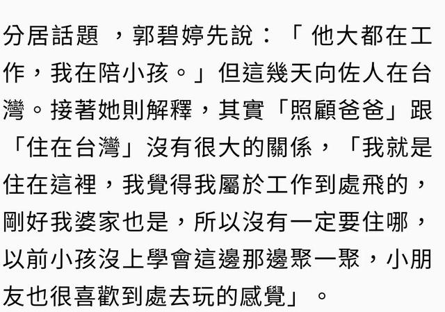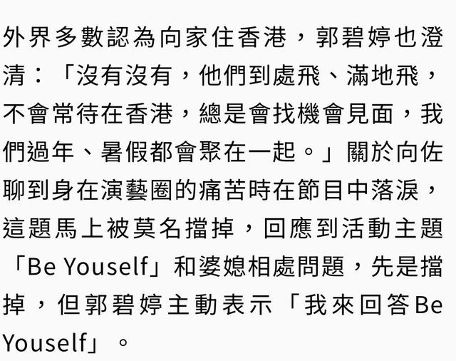 郭碧婷进一步表示,她的婆家人进军直播行业后,也没有住香港,全家人都到处飞,哪里有工作就去哪里,如果郭碧婷独自带孩子住香港,不一定会舒服。