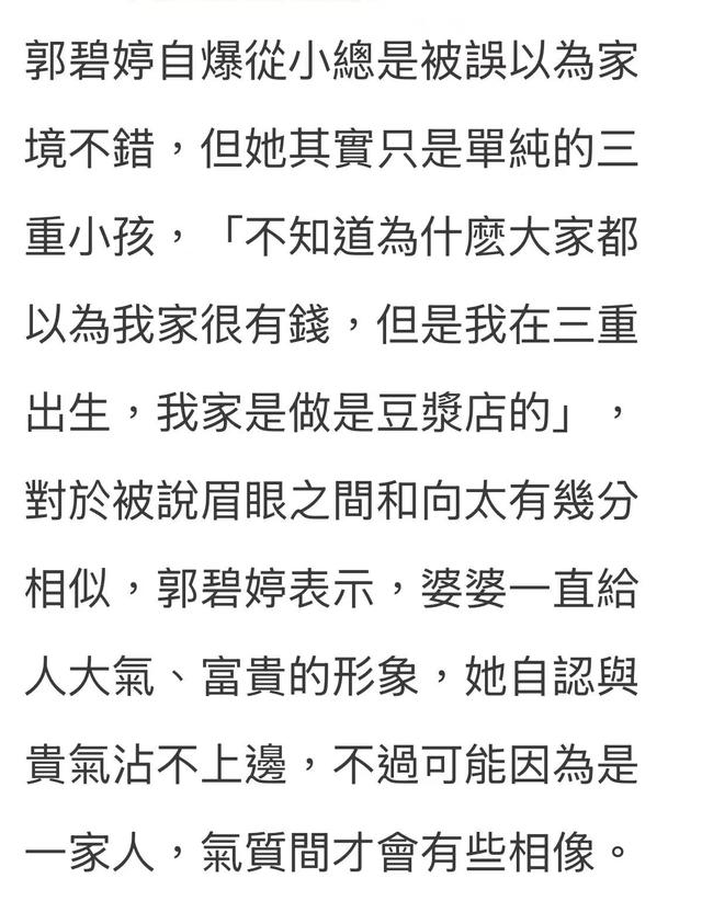 在采访中,记者指她跟向太长得像,郭碧婷笑言,很多人这样说,但她觉得婆婆天生贵气,这点是她永远比不上的。