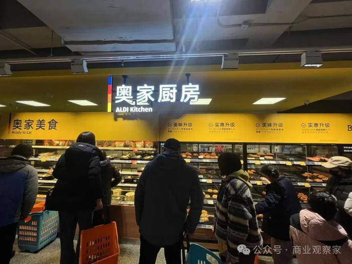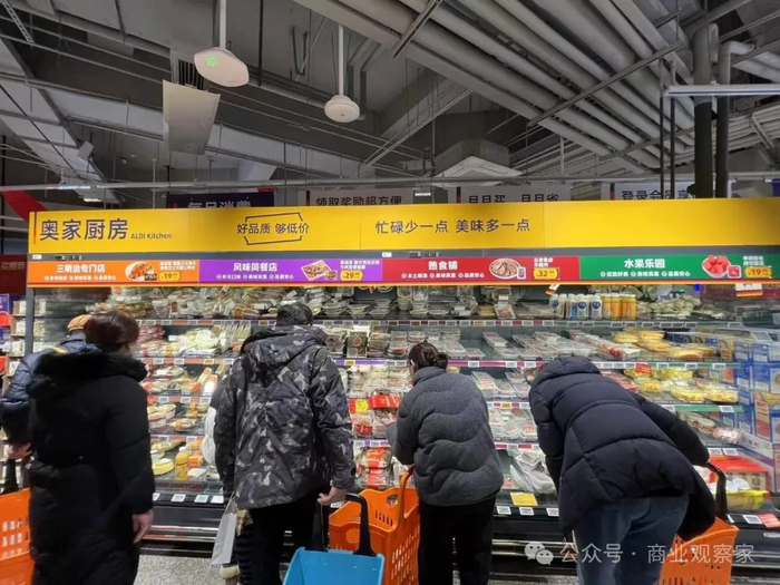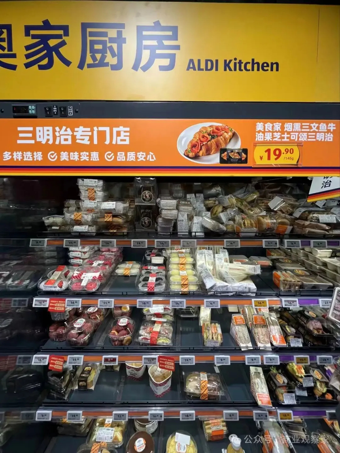 同时,奥乐齐对奥家厨房整体做了店铺化、主体化、系列化陈列售卖,比如,做了三明治专门店、风味简餐店、熟食铺、水果乐园(果切)等“分区”,做场景细分了。