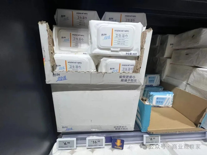 在非食百货商品层面,奥乐齐的选品也更细腻,以湿巾纸为例,这个东西,很多消费者日常是把它当一次性抹布用,用在厨房,或者餐桌等,但奥乐齐湿巾的单片装看起来对中国小家庭的使用场景与习惯有研究,单片尺寸及克重比较契合中国小家庭使用。国内一些超市做的自有品牌湿巾,整包的重量跟奥乐齐是一样的,但湿巾片数更少,单片湿巾则又重又大又粗,中国小家庭使用起来就总觉得很浪费。