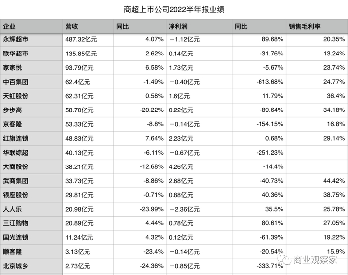 营收、净利润双双下降是上半年商超上市公司业绩的主流。