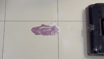 实测中,我们仅在重油污区域轻按泡沫洗按键。可以看到在按下泡沫喷洒键后,绵密泡沫瞬间覆盖污渍,生物酶成分快速乳化红油、分解色素等。紧接着AI「双刮洗」机械臂随即进入工作状态。再搭配25000Pa超强吸力与480次/分钟高速滚刷的加持,仅需单次推拉,地面的重色油污、干结米粒、黏稠混合物便被彻底清除。