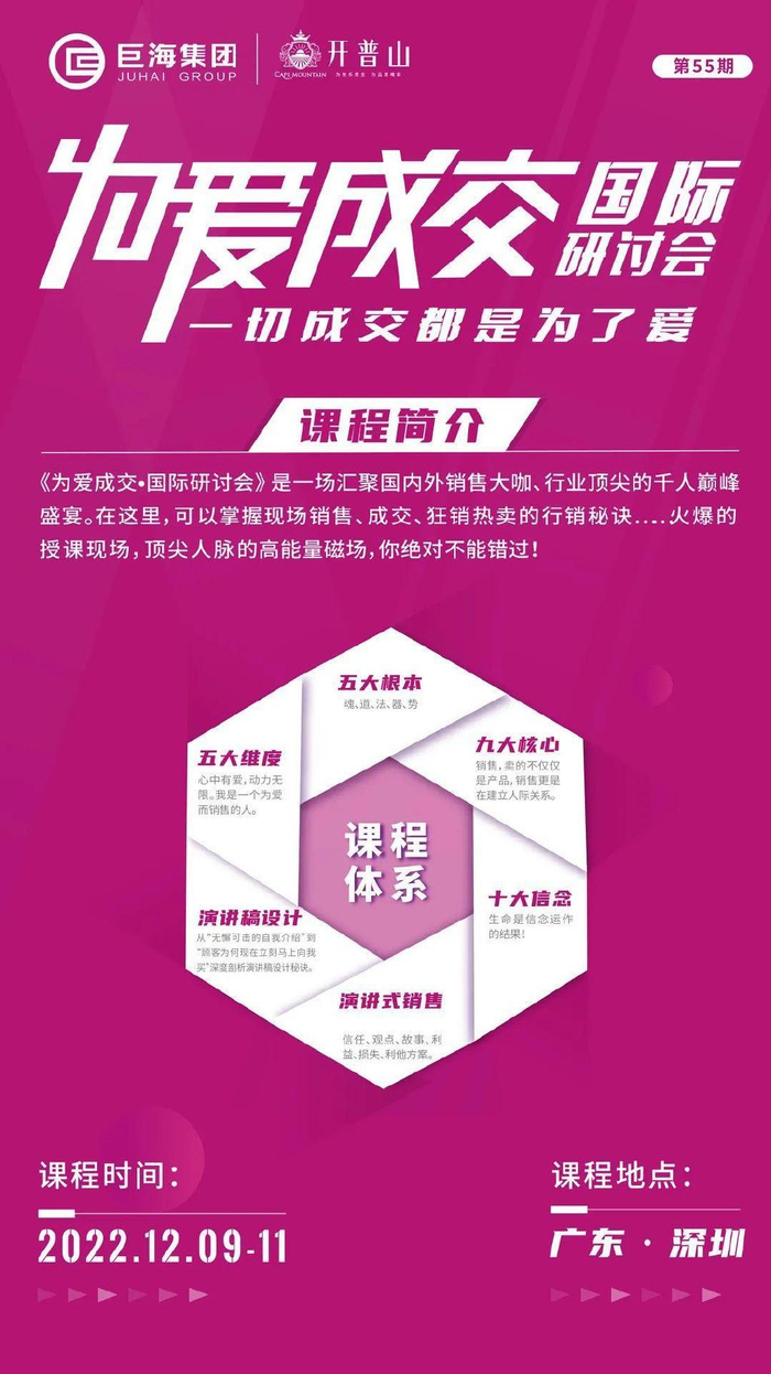 2022年12月9-11日,由巨海公司主办第55期《为爱成交·国际研讨会》广东·深圳站即将爆场开课!销售等于帮助,成交就是成就,只有把握过程,才能掌控结果。