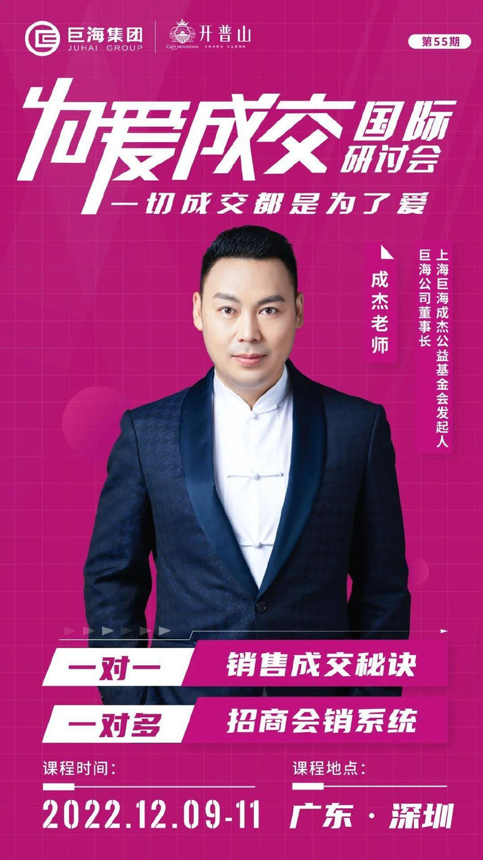 巨海公司王牌课程《为爱成交·国际研讨会》,成杰老师将分享演讲式销售创造巨大营收的核心秘籍,让你彻底敢卖、会卖、能卖、让产品狂销热卖,为你打开成交的智慧大门!