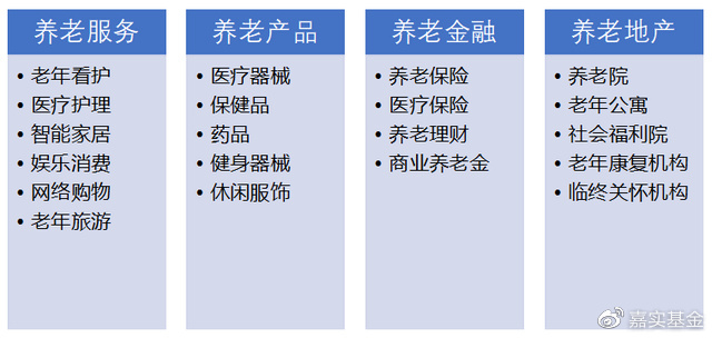 养老产业链主要涵盖养老服务,养老产品,养老金融和养老地产四大板块,其中养老服务覆盖衣食住行等多方面,包括看护护理、智能家居、老年娱乐等;养老产品主要是医疗保健类,如医疗器械、保健品等,还有休闲服饰等;养老金融以老年人对理财及保险的需求为基础;养老地产涵盖养老院、老年公寓、老年康复机构等。