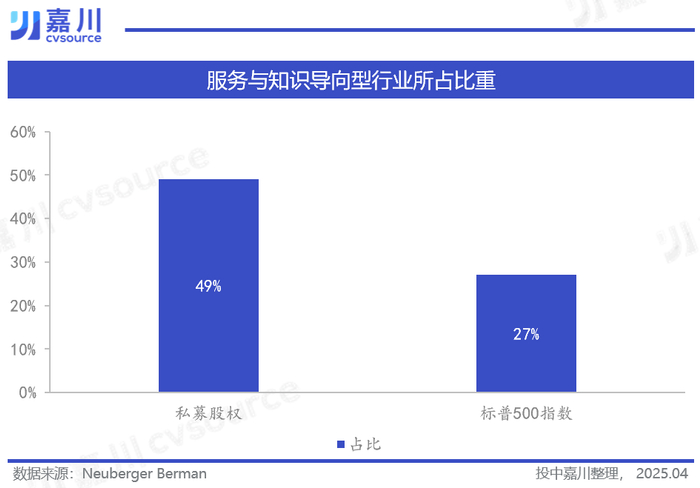 相比于整体经济或某些公开市场股票指数,私募股权资产中关税敏感行业的直接风险敞口较小。私募股权投资聚焦于以服务和知识导向为核心的领域,如科技、医疗健康等,而较少涉及依赖进口的消费品、运输设备等行业。数据显示,私募股权资产中49%集中于上述服务与知识导向型行业,而标普500指数中此类企业占比仅为27%。