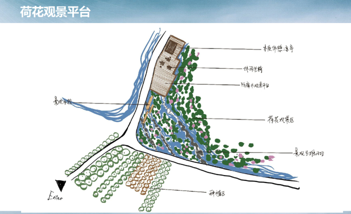 满足不同的需求,本方案通过对场地现状和使用者人群的分析,设计规划功能有以下几方面:休闲观景区域、休息区域、遮阳避雨区。绿色能缓解眼睛疲劳,满足村民以及游客对于绿色的需求。