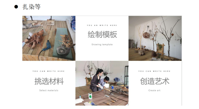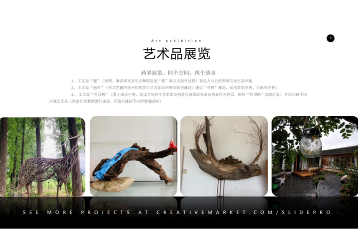 以旗山湖乡间小路的自然景观为环境依托,森林、田野、小溪、草原、大山等为展览空间及背景,以部分展览作品创作涵义、背景为故事线,如鹿、抱石、丹顶鹤等。“即兴、跨界”为展览理念,将静态艺术品结合音乐、舞蹈、戏剧即兴表演跨界融合形成流线动态展览,从而更有艺术性、审美性地讲述工艺品创作涵义及匠人创作过程、心得,从而传达美丽乡村的新生活方式和生活美学。