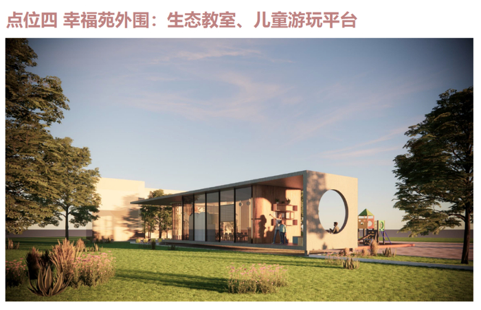 时光小院位于两条村内主路相交处,毗邻小休自然学校和萌宠乐园,以现状草坪为景观基底,主要用途为观赏;