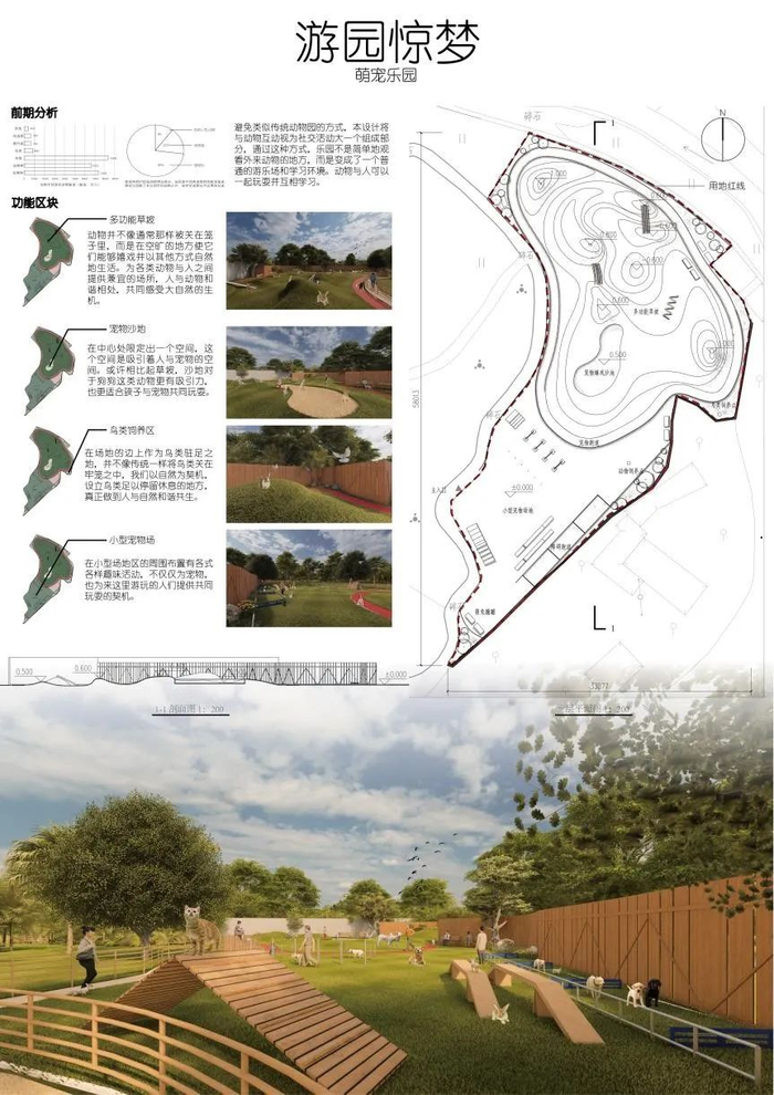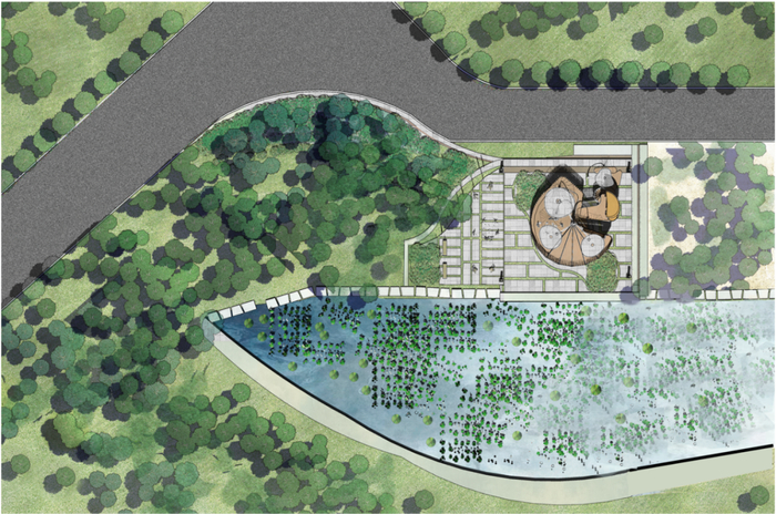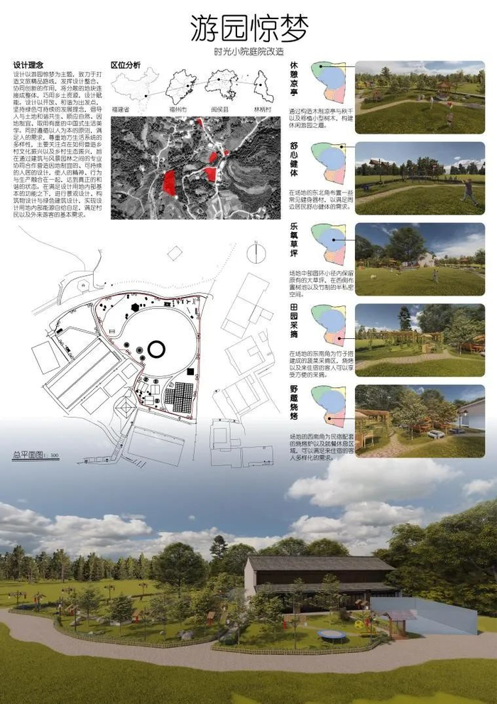 设计以开放、和谐为出发点,坚持绿色可持续的发展理念,倡导人与土地和谐共生、顺应自然、因地制宜、取用有度的中国式生活美学。同时遵循以人为本的原则,满足人的需求,尊重地方生活系统的多样性,主要关注点在如何营造乡村文化振兴以及乡村生态振兴,旨在通过建筑与风景园林之间的专业协同合作营造因地制宜的、可持续的人居设计,使人的精神、行为与生产融合在一起,达到真正的和谐的状态。在满足设计用地内部基本的功能之下,进行景观设计、构筑物设计与绿色建筑设计,实现设计用地内部能源自给自足,满足村民以及外来游客的基本需求。