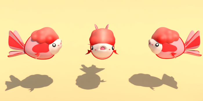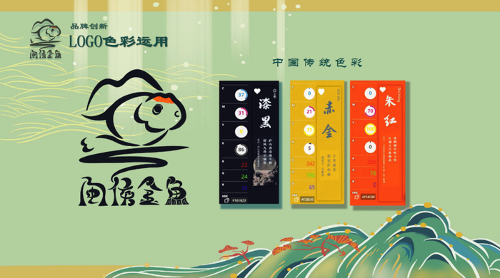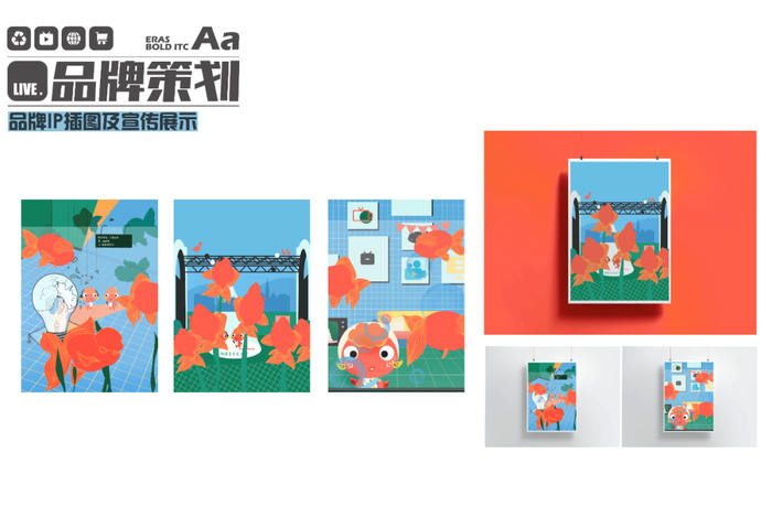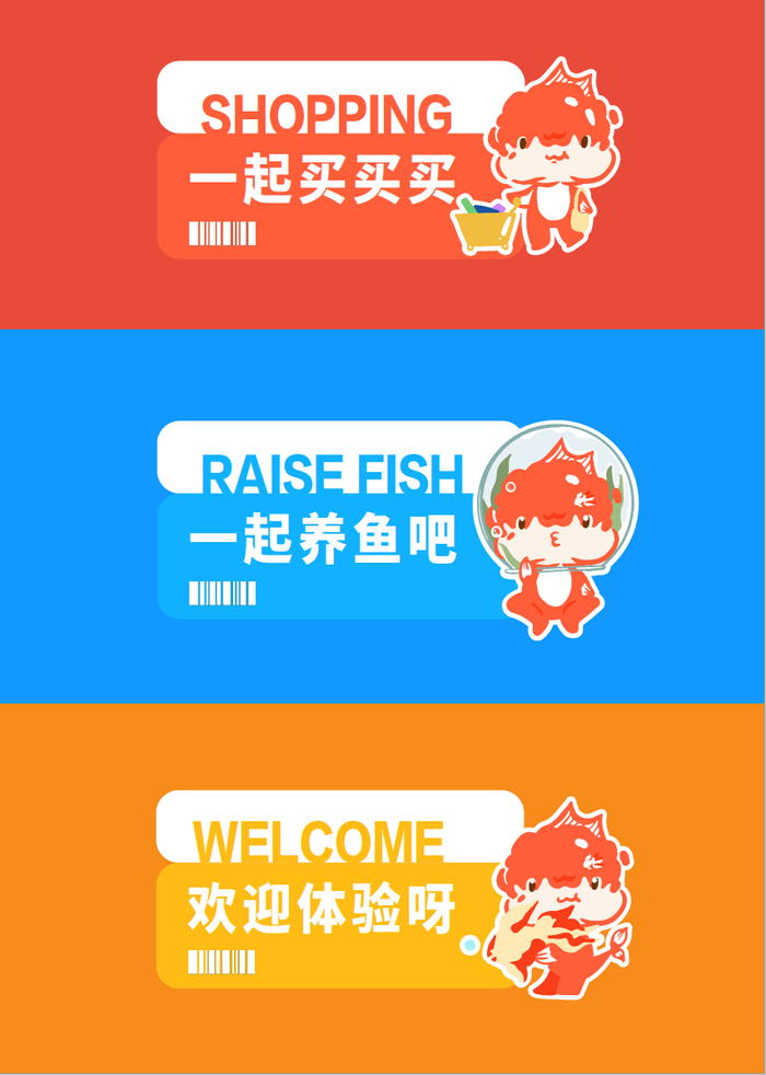 现有的主题上用简洁欢快的形式展现金鱼的品牌形象,采用憨态可掬的卡通形象展示作品,凸显独有的个性。在造型方面圆润活泼的形态更好地体现金鱼的可爱形象,配色方面运用了撞色的搭配,与其形象的相契合。