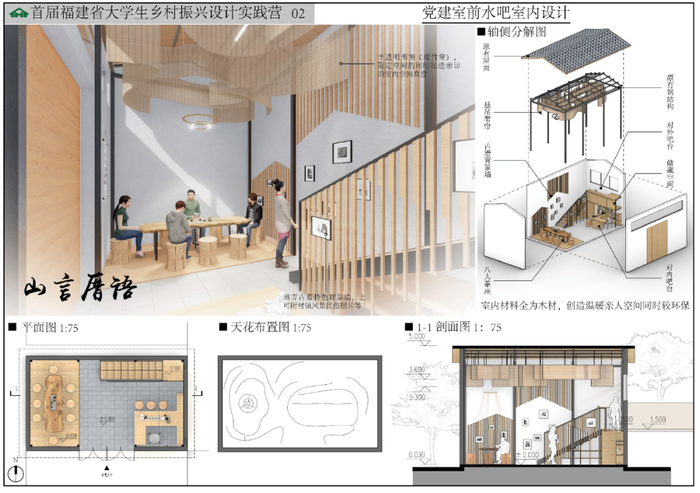 本设计发掘了场地的特点与矛盾,将水吧室内局部地面抬高形成对外服务吧台,服务党建室前大平台可能产生的茶歇。在室内空间处理上,以入口为界将室内分为吧台座位和八人茶座两部分,并以古厝和山脉为灵感处理墙面、吊顶装饰。材料基本选用木材,桌椅等尽量选用自然风格,达到环保目的的同时营造自然水吧气息。