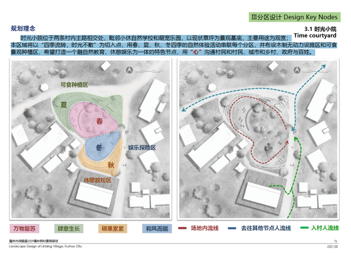 本区域将以“四季流转,时光不散”为切入点,用春、夏、秋、冬四季的自然体验活动串联每个分区,并布设木制无动力设施区和可食景观种植区,希望打造一个融自然教育、休憩娱乐为一体的特色节点,用“心”沟通村民和村民、城市和乡村、政府与百姓。