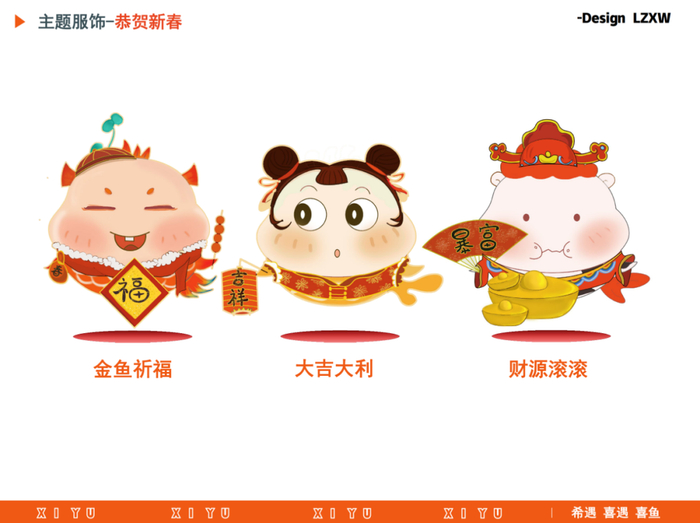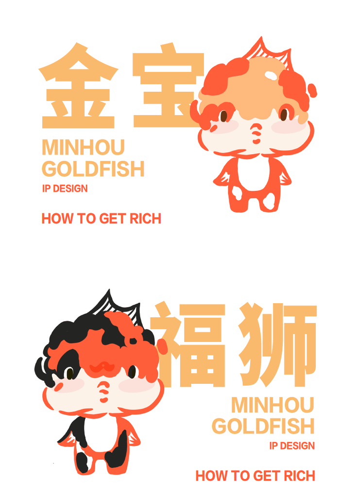 借助闽侯金鱼产业的发展背景,开创闽侯金鱼特色IP文化。对闽侯主要福寿金鱼形象进行核心元素的提炼,保留一定的写实方式,塑造萌系IP,具有一定的延展性。我们提取了闽侯福寿金鱼的三个特色品种,奶牛花寿、龙晴高头、水墨狮头的颜色,分别创作了“招财”“金宝”“福狮”三个形象。圆圆的脑袋非常具有亲和力。配色上采用了红色作为主色调。基于IP原型进行了表情包设计,延展设计等。萌且具有标识度的形象,可塑性很强。一定程度上增加了亲民性。从视觉上强化了金鱼IP的特征,最终实现将金鱼文化走向全国及世界的可观的传播效果。
