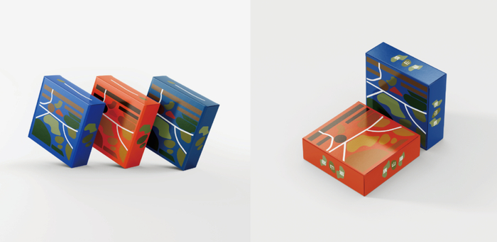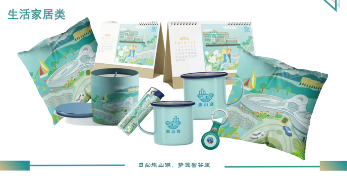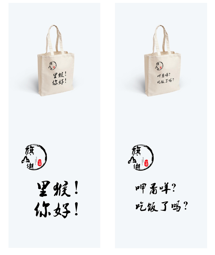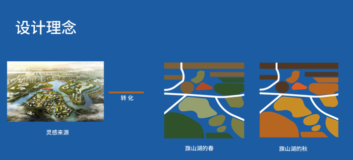 从旗山湖卫星图得到灵感,以碎片化重组分割的方式进行呈现并做了春秋系列不同景象的形式让旗山湖更具有地域代表性,增强其识别力度。同时,体现环保理念和可持续发展战略。