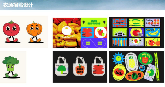IP形象打造、色彩搭配都采用了活泼的风格,插图的简单线条和对比分明的色块结合,体现了独特的美感。整体内容设计在符合品牌调性的同时,时刻围绕着IP主播的身份,比如画面的镜头感设置、主播的多变身份转换等等。其次,该品牌策划的核心是直播这一宣传方式,从视觉角度传达直播形式带给新农村的新变化与新机会。