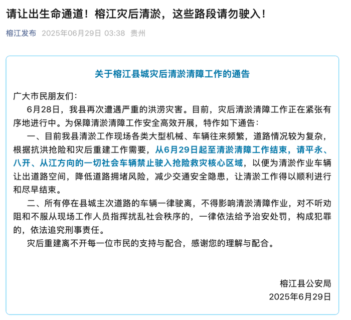 6月29日凌晨,贵州榕江县公安局发布《请让出生命通道!榕江灾后清淤,这些路段请勿驶入!》,详情如下: