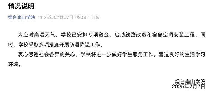 烟台南山学院7月7日发布情况说明称,为应对高温天气,学校已安排专项资金,启动线路改造和宿舍空调安装工程。同时,学校采取多项措施开展防暑降温工作。