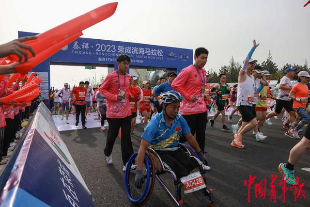 4月30日,山东荣成,2023荣成滨海马拉松赛上,55岁的轮椅选手高丰(前)在起跑,他参加的是全程马拉松项目。高丰是威海市一家公益机构的学员,也是一名运动达人,参加过全国各地30多场半程、全程马拉松比赛,在其他各项运动赛事中也获得了70多枚奖牌。他练马拉松已经七八年了,全程马拉松最好成绩是3小时50分。中青报·中青网记者 曲俊燕/摄