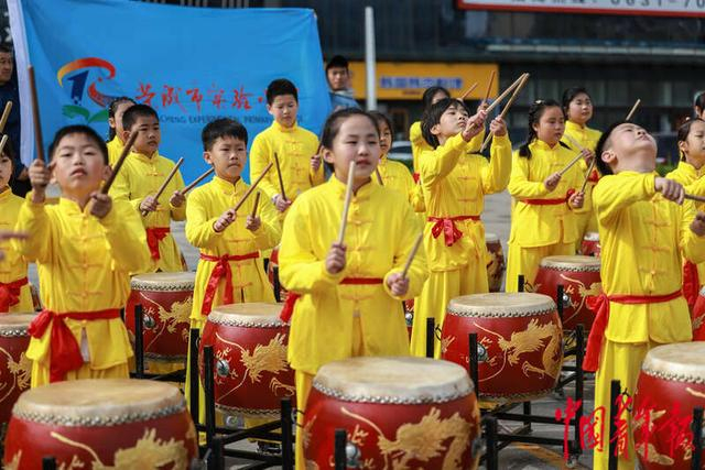 4月30日,山东荣成,2023荣成滨海马拉松赛上,荣成市实验小学的学生们在路边打鼓,为选手助威。中青报·中青网记者 曲俊燕/摄