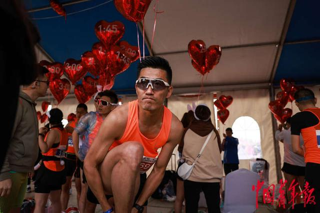 4月30日,山东荣成,2023荣成滨海马拉松赛上,一名领跑员在更衣区换鞋,准备上赛道。领跑员们被安排在比赛的不同时间段领跑,需要精准控制配速。中青报·中青网记者 曲俊燕/摄