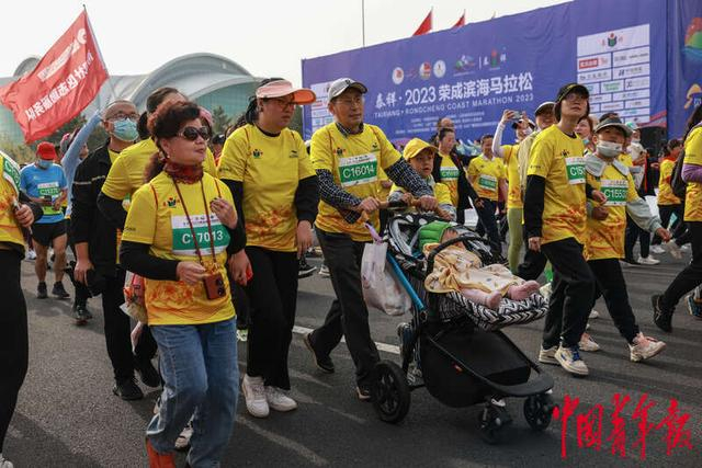 4月30日,山东荣成,2023荣成滨海马拉松赛上,参加欢乐跑项目的选手推着婴儿车起跑。中青报·中青网记者 曲俊燕/摄