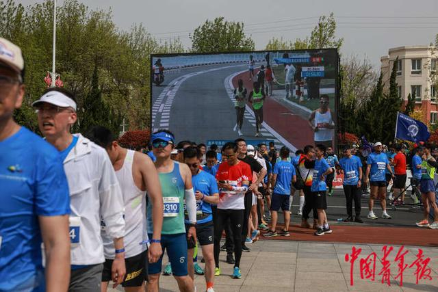 4月30日,山东荣成,2023荣成滨海马拉松赛上,半程马拉松完赛选手在终点排队登记,屏幕上是全程马拉松女子组的两名领先选手。中青报·中青网记者 曲俊燕/摄