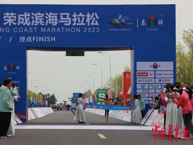 4月30日,山东荣成,2023荣成滨海马拉松赛上,全程马拉松男子组埃塞俄比亚选手德雷杰·德贝莱·图卢率先冲过终点线。中青报·中青网记者 曲俊燕/摄