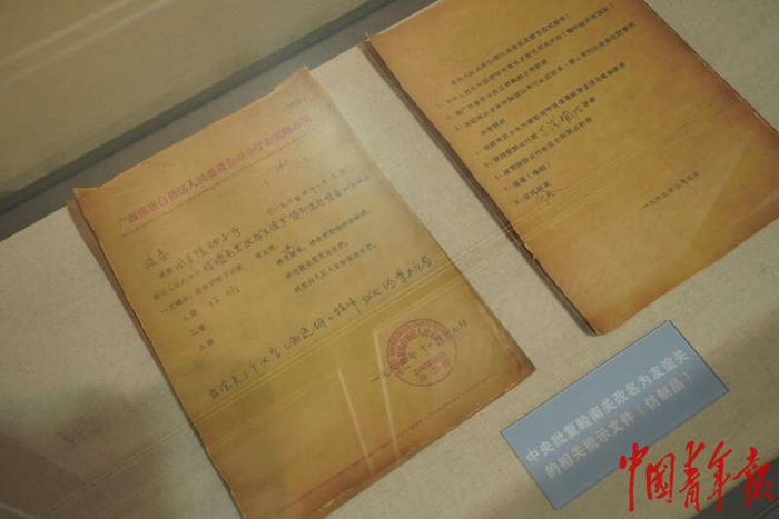 5月21日,广西凭祥,友谊关关楼展览厅展出中央批复友谊关更名相关批示文件的仿制品。1965年,中国将“睦南关”更名为“友谊关”,越南也将对面相应的口岸更名为“友谊口岸”。零公里线两侧同时存在两个“友谊”,成为中越友谊历史的重要见证。马子倩/摄