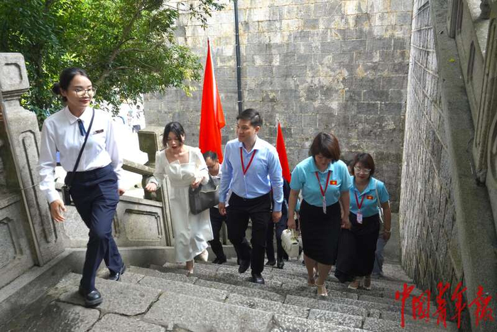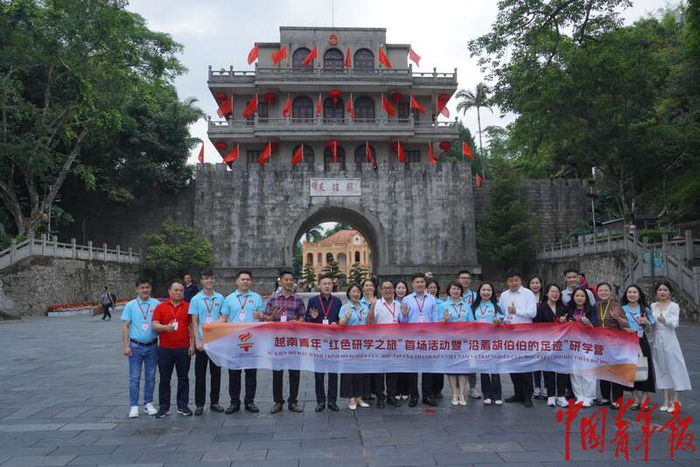5月21日,广西凭祥,参加越南青年“红色研学之旅”首场活动暨“沿着胡伯伯的足迹”研学营的中越青年代表登上友谊关关楼。友谊关坐落在中越边境线上,是中国九大名关之一,也是九大名关中现在仍然保持通关功能的唯一边关。友谊关口岸是中国通往越南等东盟国家最便捷的陆路大通道之一,也是中国最大陆路水果进出口口岸和中越游客出入境旅游的“黄金通道”。马子倩/摄